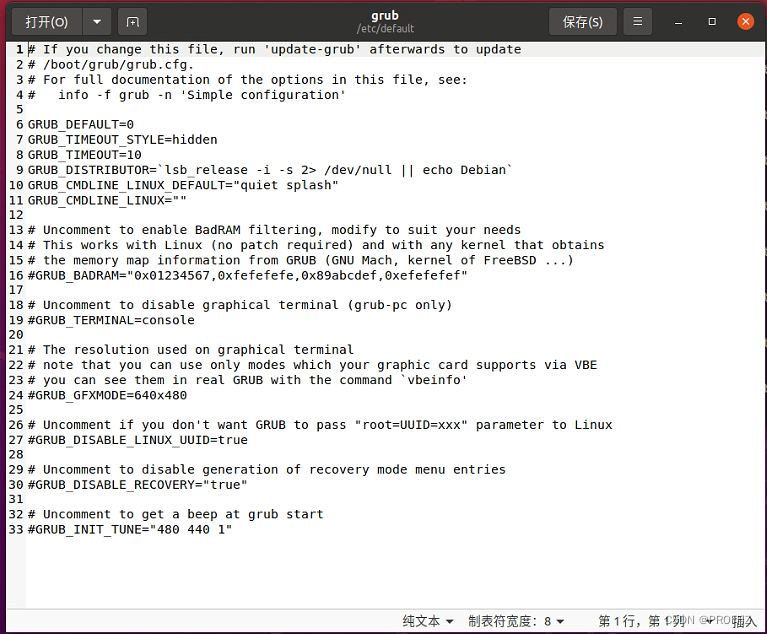 1. 打开终端(快捷键 Ctrl+Alt+T),输入以下命令。使用 gedit 编辑器打开系统中的 /etc/default/grub 这个文件进行编辑。