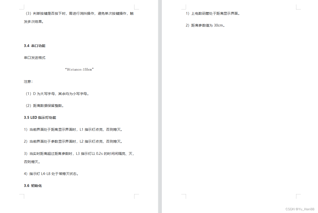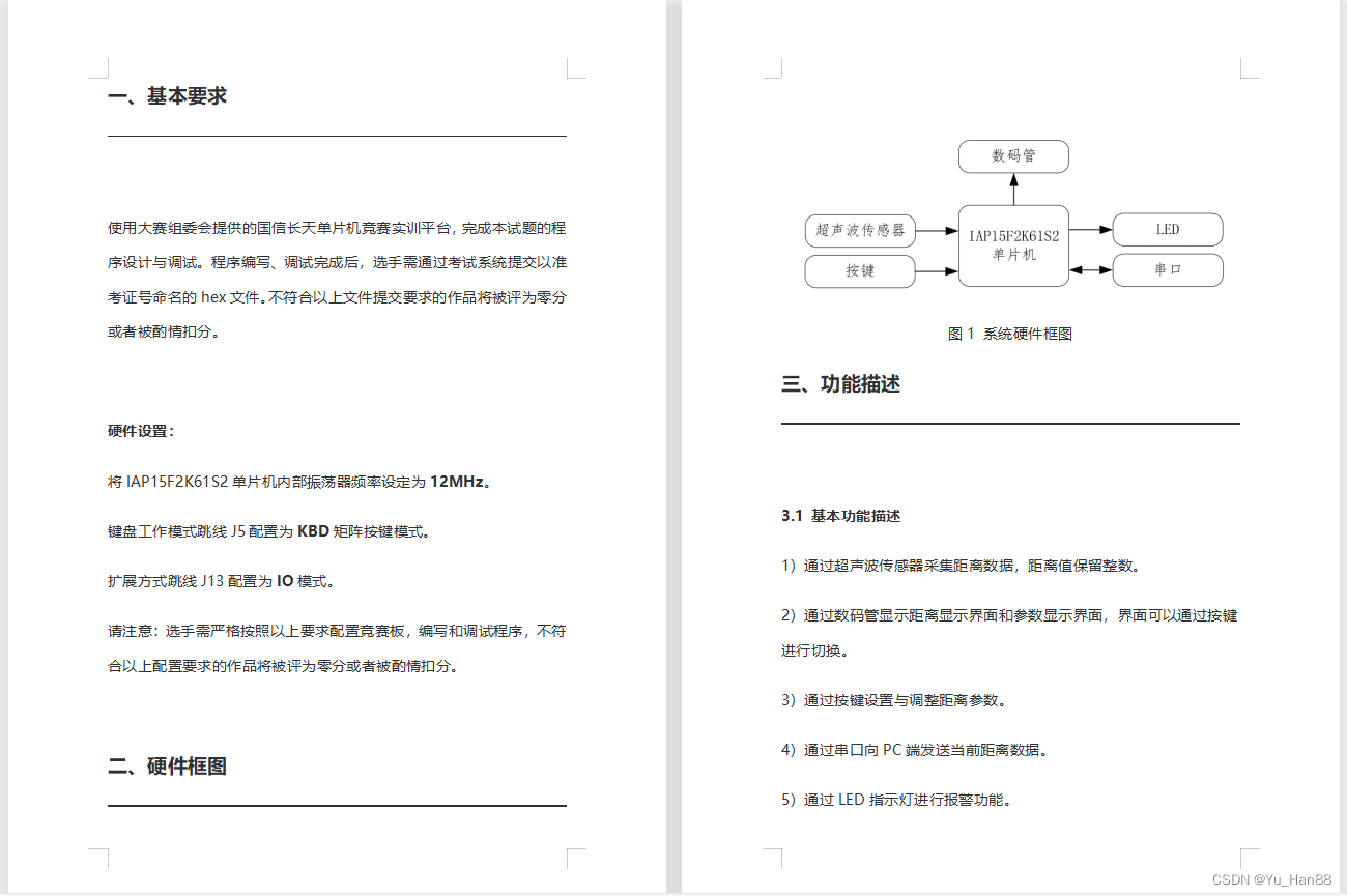 该代码实现了一个基于单片机的系统,主要功能包括超声波测距、液晶显示、按键控制以及UART通信。系统使用定时器中断来实现不同时间间隔的任务,如每100ms、200ms、500ms和1s执行不同的操作。超声波测得的距离会与预设阈值进行比较,并在LCD上显示。同时,用户可以通过按键来设定阈值或查看当前距离。UART接口用于发送数据。