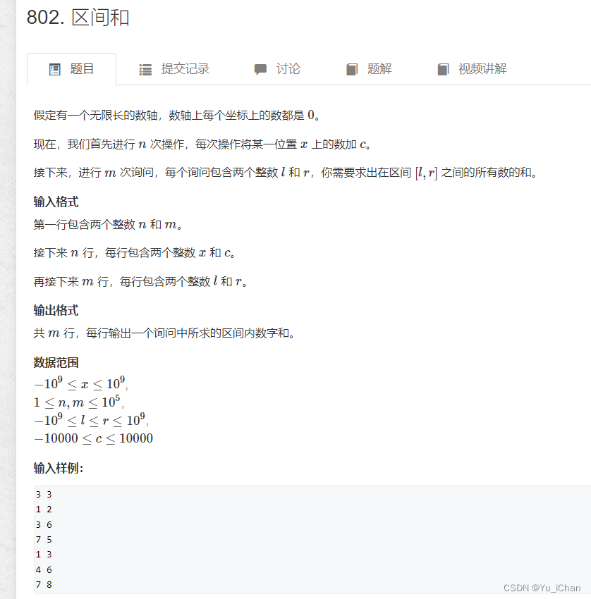 由题目可知x的数据范围为10的九次方,这个范围已经超过了我们数组可以开出的长度,并且,我们的n和m只有10的五次方,也就是需要操作的数最多只有3✖10的五次方个数,远远小于了x的数据范围,于是我们想到了离散化,也就是将所需要操作的数进行一个排序并且去重。是他们是有序的,也就是省去了中间是0的那些空间。