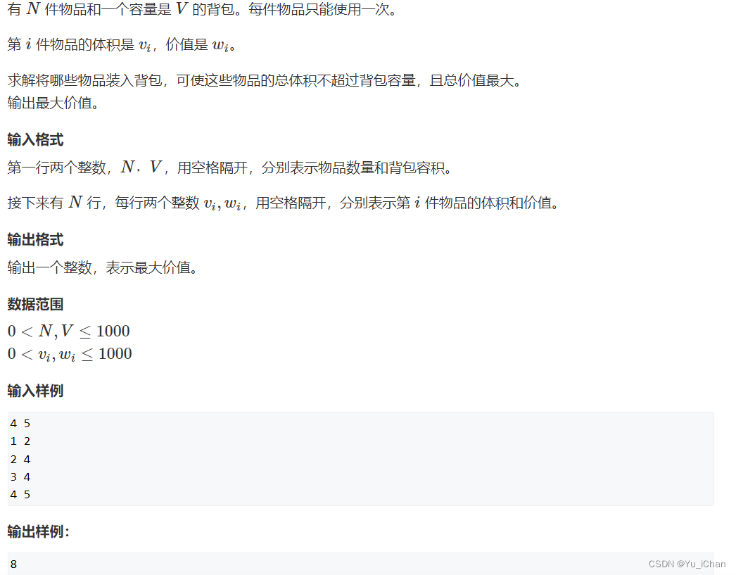 状态表示划分为一个集合以及一个集合的属性这里我们用f[i][j]表示选前i个物品,体积不超过j的价值集合,那么题目要我们求的是最大价值,所以最大价值就是属性