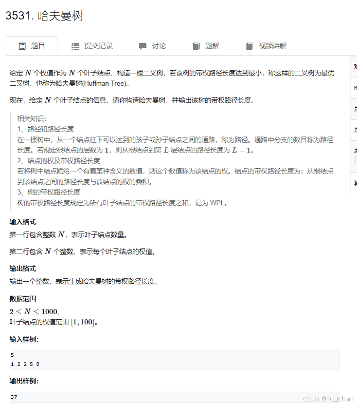 本题给我们n个节点要我们求其构成的哈夫曼树的带权路径长度,这个一般有两种求法,书面上的。求每个叶子节点的路径长度✖权值并且相加,或者将每一个非叶子节点的权值相加即为答案。