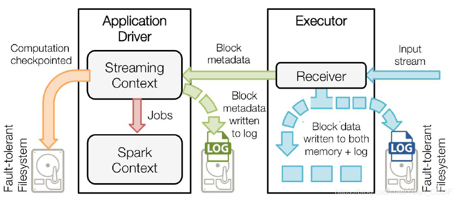 1.接收器把数据流打包成块,存储在executor的内存中,如果开启了WAL,将会把数据写入到存在容错文件系统的日志文件中。