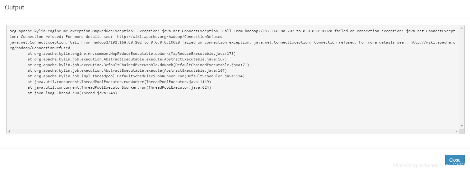 org.apache.kylin.engine.mr.exception.MapReduceException: Exception: java.net.ConnectException: Call From hadoop2/192.168.80.202 to 0.0.0.0:10020 failed on connection exception: java.net.ConnectException: 拒绝连接; For more details see: http://wiki.apache.org/hadoop/ConnectionRefused