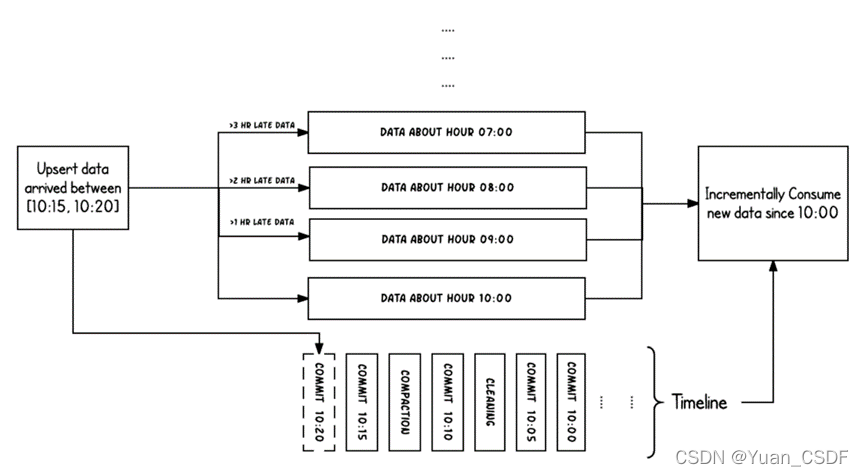 上图中采用时间(小时)作为分区字段,从 10:00 开始陆续产生各种 commits,10:20 来了一条 9:00 的数据,根据event time该数据仍然可以落到 9:00 对应的分区,通过 timeline 直接消费 10:00 (commit time)之后的增量更新(只消费有新 commits 的 group),那么这条延迟的数据仍然可以被消费到。