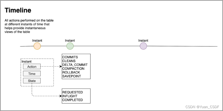 hudi的核心是维护在不同时刻在表上执行的所有操作的时间表,提供表的即时视图,同时还有效地支持按时间顺序检索数据。Hudi的时刻由以下组件组成: