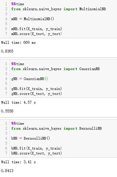 上面是获取数据集,接下来利用贝叶斯进行分类并测试准确性。下面是利用多项式分布朴素贝叶斯计算得结果。准确率0.8365,耗时 Wall time: 669 ms 。其他形式以图片形式展示,可以自己尝试一下。