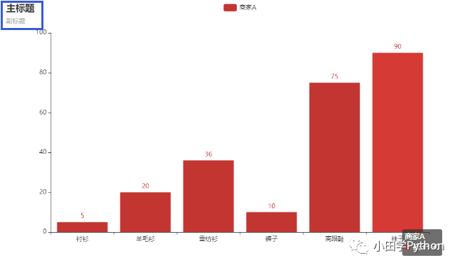 上方程序显示结果比前面的程序多了蓝色方框中的内容,也就是主/副标题。对应的程序为bar.set_global_opts(title_opts=opts.TitleOpts(title="主标题", subtitle="副标题")),下面就来解析一下这句代码。