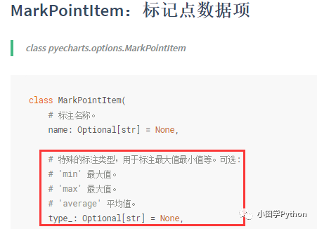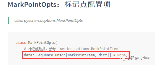 看一下上面图中的标记点配置项,其中的 data 属性,data: Sequence[Union[MarkPointItem, dict]] = None,表明是个 Sequence 类型,而这个队列里面是系列配置项中的标记点数据项(MarkPointOpts),也就是标记点数据项继承自标记点配置项。在看一下标记点数据项。