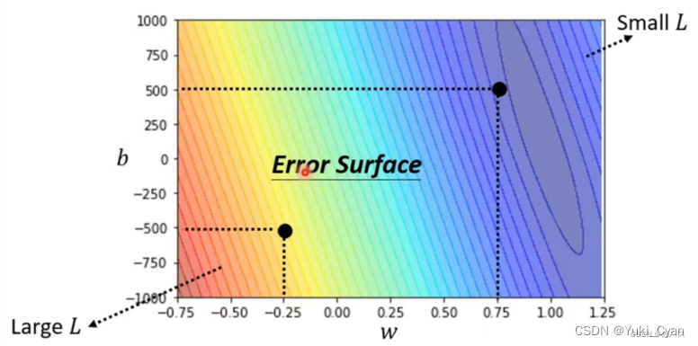 计算Loss画出等高线图,可以得到如下图(Error Surface)所示的结果: