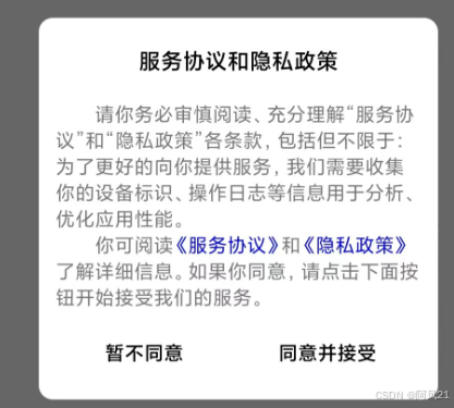 "message" : " 请你务必审慎阅读、充分理解“服务协议”和“隐私政策”各条款,包括但不限于:为了更好的向你提供服务,我们需要收集你的设备标识、操作日志等信息用于分析、优化应用性能。<br/> 你可阅读<a href=\"https://www.meixizi.cn/test.html\">《服务协议》</a>和<a href=\"https://www.xizizhijia.cn/tet.html\">《隐私政策》</a>了解详细信息。如果你同意,请点击下面按钮开始接受我们的服务。",