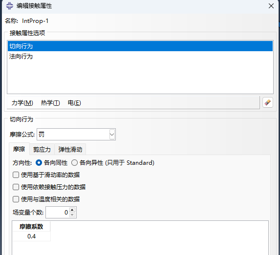 - 摩擦模型选择库伦摩擦:法向使用硬接触,切向接触为罚接触,摩擦系数设置为0.4。