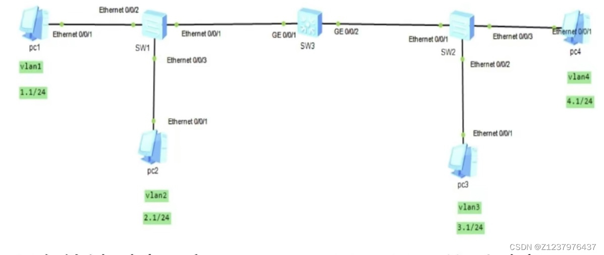 SW1交换机eQ/0/2口对应vlan1;eo/0/3口对应vlan2;