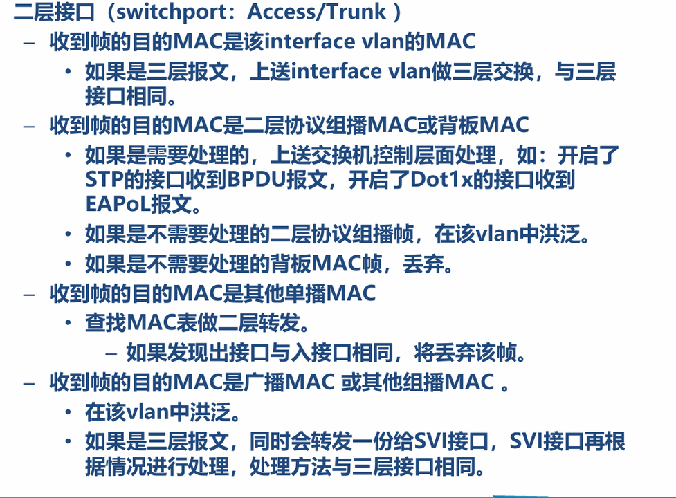 - 二层协议组播帧(如某些组播地址但无对应协议处理)→ 在本 VLAN 内洪泛(除入接口外,所有同 VLAN 接口广播)。