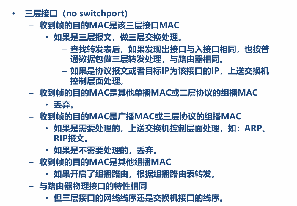- 原因:三层接口工作在 “纯三层”,不处理二层单播 / 无关组播(这些属于二层转发逻辑,三层口已剥离二层功能 )。