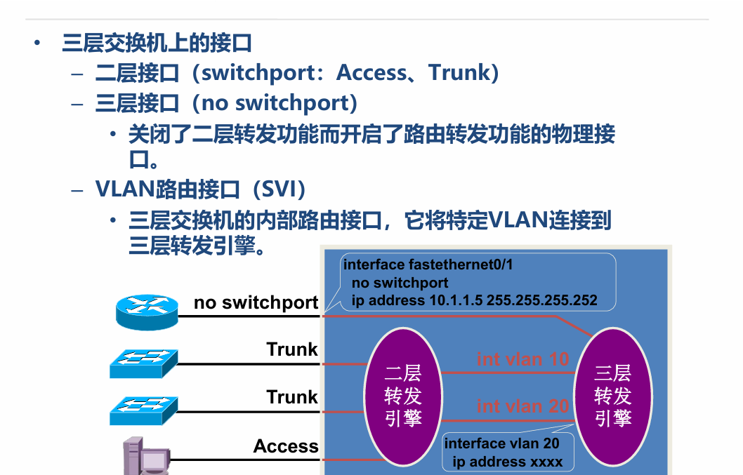 VLAN路由接口(SVI)虚接口:三层交换机的内部路由接口,它将特定VLAN连接到三层转发引擎。