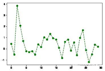 matplotlib的plot函数接受一组X和Y坐标,还可以接受一个表示颜色和线型的字符串缩写:**‘g–’,表示颜色是绿色green,线型是’–'虚线。**也可以使用参数明确的指定。