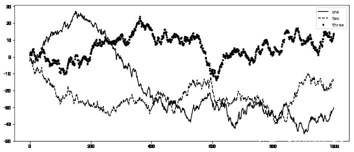 ax.plot(np.random.randn(1000).cumsum(),'k',label='one') #传入label参数,定义label名称