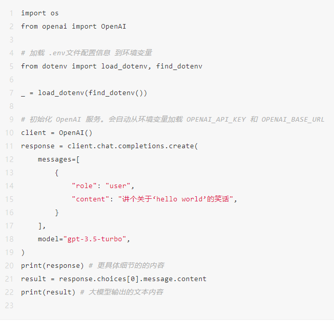其中python-dotenv 这个库是用于从.env 文件读取键值对,并将它们添加到环境变量中,后面代码中会用到,openai是调用GPT API使用的包.