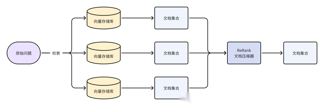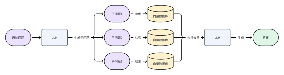 如果直接使用原始问题进行检索,可以因为用户的表述偏差导致检索不到相关的文档。多查询重写策略的核心思想是利用大语言模型(LLM)对原始问题进行扩展、分解或抽象,生成多个语义相关但视角不同的子查询,从而提高检索系统对用户意图的覆盖能力。这种方法能有效解决单一查询可能存在的表述偏差或信息不全问题。整体流程如下所示:
