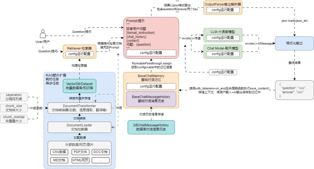 一个完整的RAG应用开发流程,涉及到文档加载器、向量数据库、检索器、Prompt、记忆、输出解析器、大语言模型、多个功能模块,如下所示: