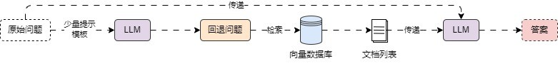 问题回退策略和问题分解策略相反,当用户问题非常具体时,可能无法检索的对应文档,就需要将问题进行抽象。比如“李开复在2000年是在哪个公司工作?”,重新抽象成“李开复的工作经历是什么?”。处理流程如下:
