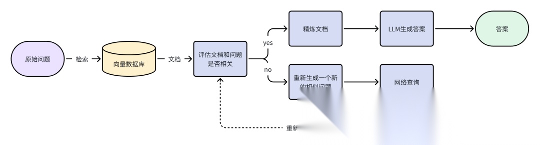 - 网络搜索:在需要时,CRAG会执行网络搜索以寻找更多高质量的知识来源,以纠正或补充检索结果。