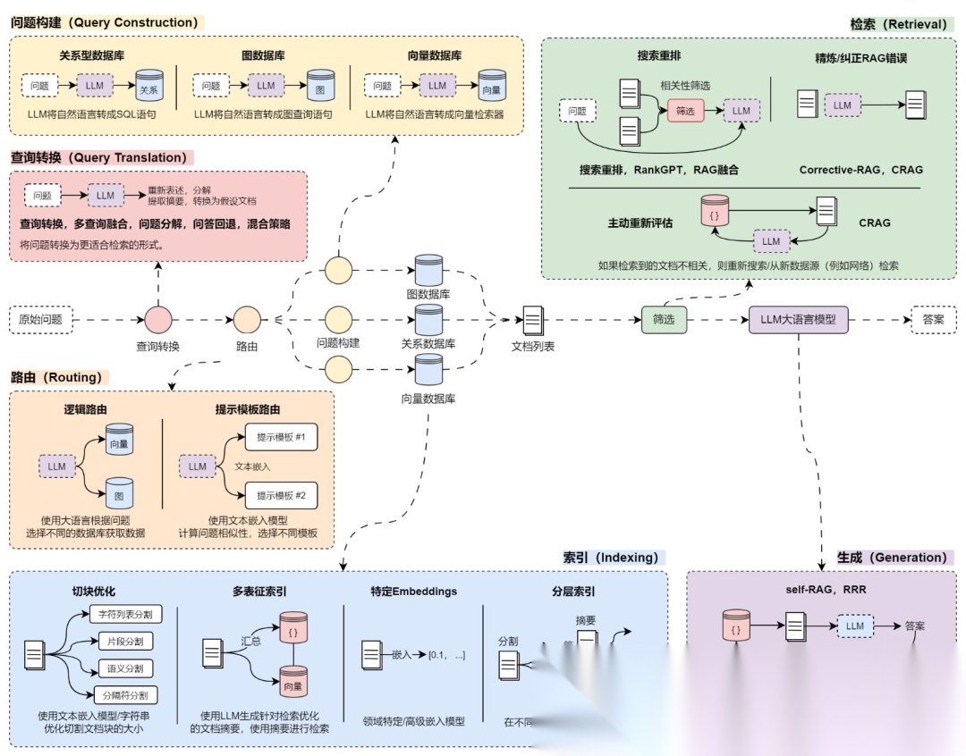 通常RAG的优化策略主要分为:查询转换、路由、问题构建、索引、检索和生成六个方面进行,如下与所示: