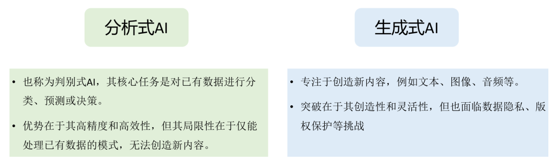 从应用场景划分,AI可分为生成式AI和分析式AI两大类,具体如下: