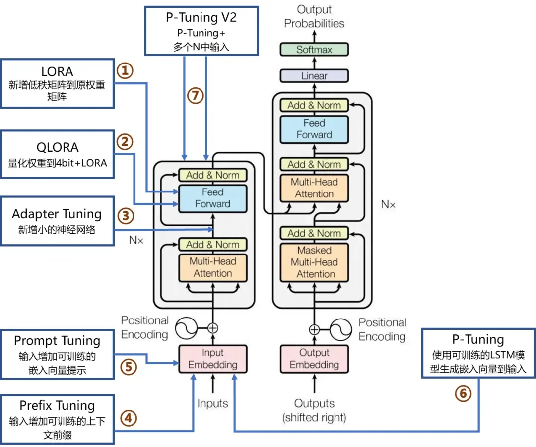 - 基于低秩矩阵分解的微调:如LoRA、LoHa、AdaLoRA等,通过分解权重矩阵减少需要更新的参数量,大幅降低计算需求。