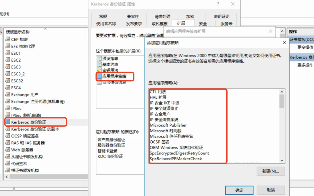 其中版本架构就是我们上面所说的模板版本,预期用途就是这个证书模板申请之后用来干什么,例如可以客户端身份验证、服务器身份验证等,如果要设置模板特定用途可以右击模板属性在应用程序策略中添加或删除证书模板用途。