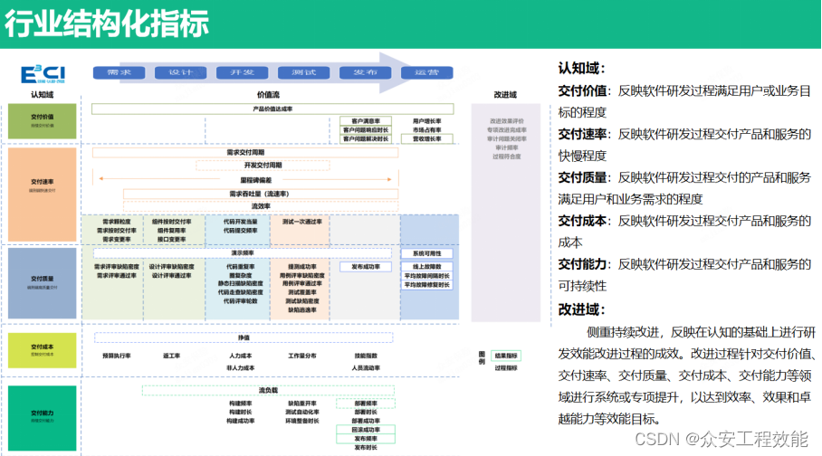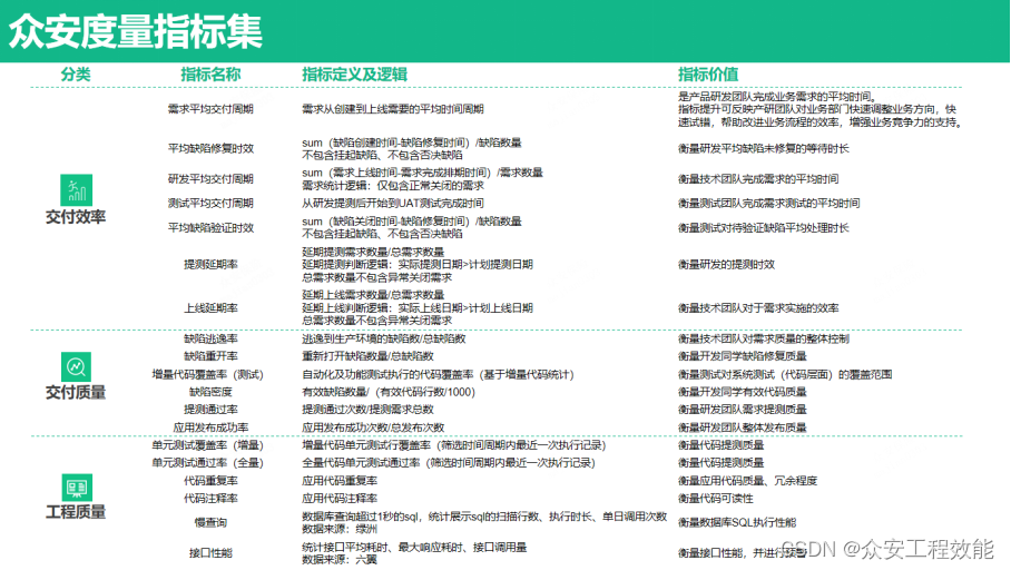 效能度量可以采用多种指标,可以分为质量、效率、成本、客户满意度等方面。以下是众安常用的效能度量指标: