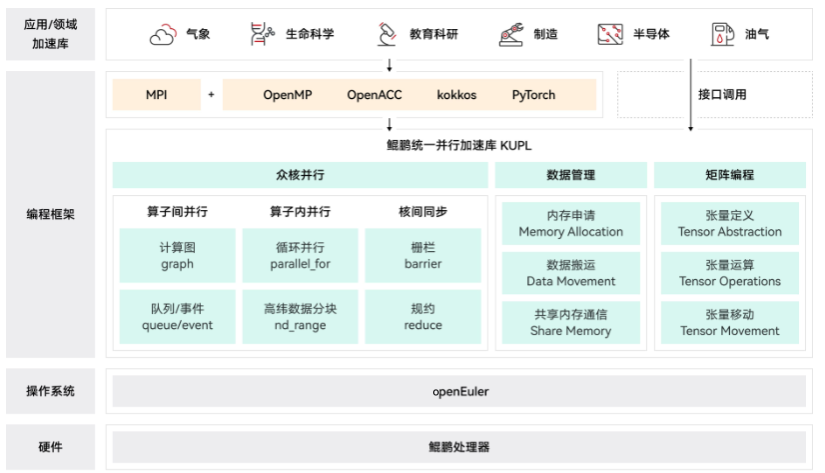 同期即将开源的鲲鹏统一并行加速库( KUPL )则是基于鲲鹏处理器深度优化的并行加速库,包括多线程编程、数据管理、矩阵编程三类基础与拓展功能,结合鲲鹏处理器硬件特性,提供优化的调度与同步算法、异步数据搬运等差异化能力,从高性能、高易用角度为鲲鹏平台应用加速提供助力。