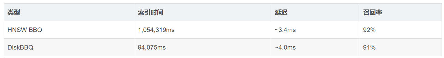 表 0. DiskBBQ 在超过 100 万向量下的对比。所有数据都能舒适地放入内存。DiskBBQ 在索引速度上能快上惊人的 10 倍,同时在 BBQ 量化向量上的查询速度几乎与 HNSW 一样快。