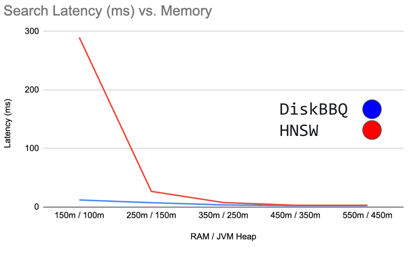 当内存逐渐减少到整个索引不再能完全放入内存时,情况会变得更有趣。我们将会单独写一篇博客来深入探讨为什么 DiskBBQ 在低内存环境下更好,以及我们的测试方法。然而,这里先给出一些高层级的数据: