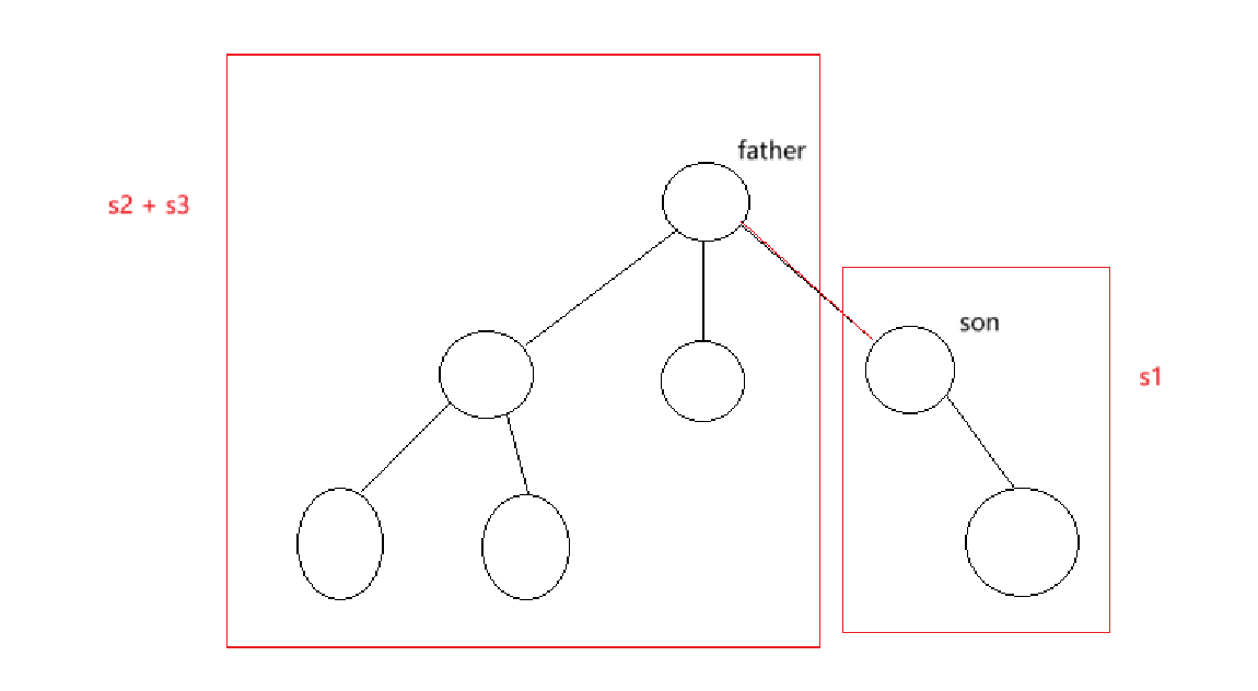 本题我们可以采用双重DFS,我们先假设树整体为 s,分为三个部分分别为 s1、s2、s3。首先,第一重DFS用于确定一条删除的边,我们从节点 0 开始DFS,进入DFS函数后有子节点 son 和父节点 father,我们将父子节点的边删除,包含子节点的部分记为 s1 而父节点部分由 s2 和 s3 组成。接下来我们要进入第二层DFS,在父节点部分找到一条边划分出 s2 和 s3。