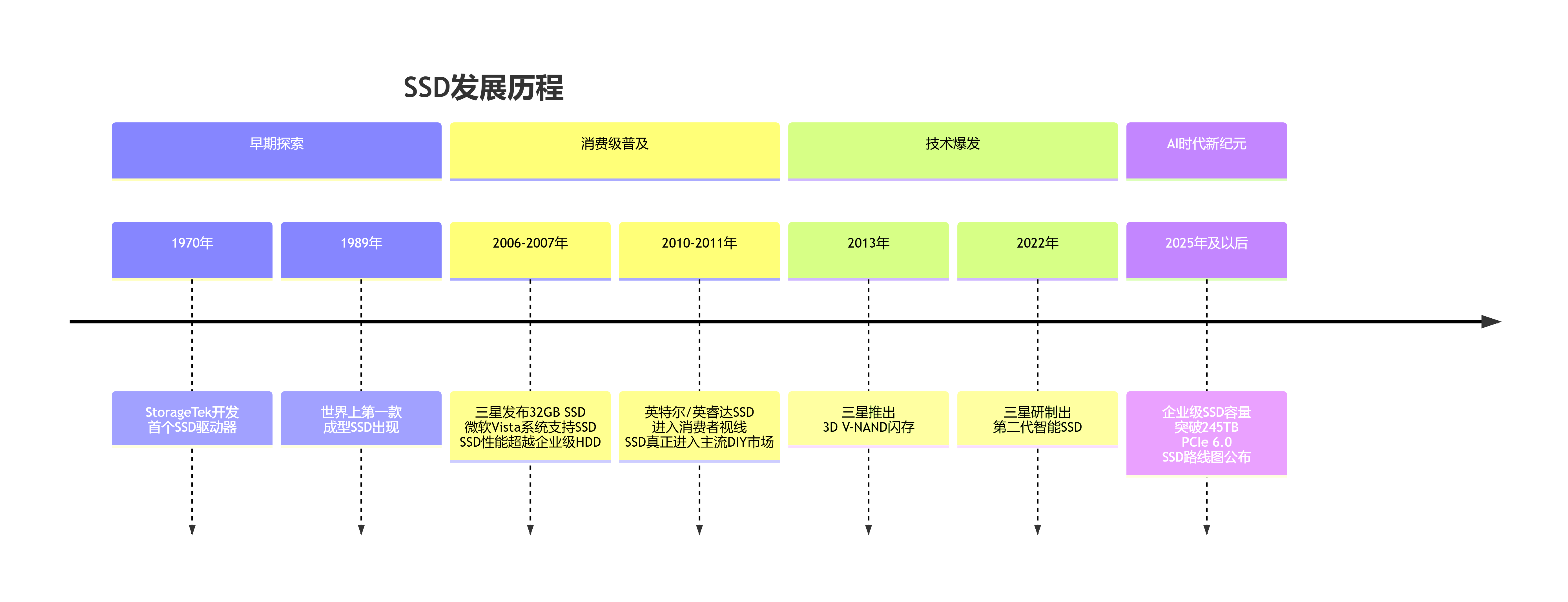 固态硬盘(SSD)的发展,是一部从实验室走向千家万户、从昂贵军用品变为核心AI基础设施的创新史诗。下面这张时间轴,帮你快速梳理其发展脉络。