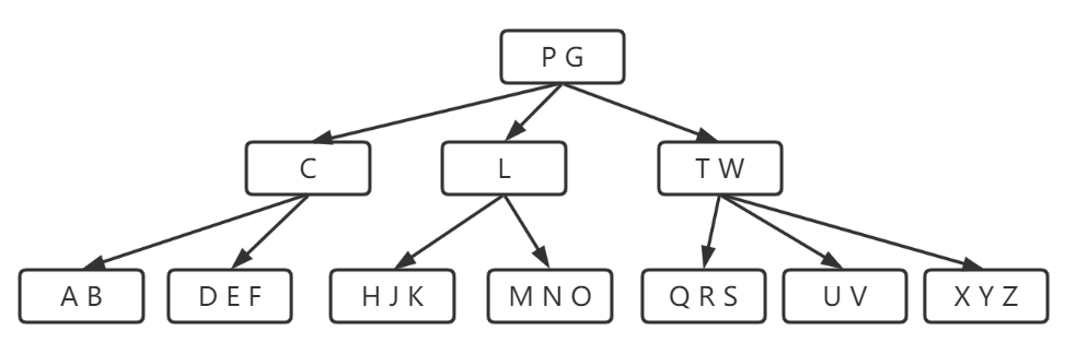 为了使大家在概念上更方便理解,正如先前在二叉排序树中做的那样,我们使实际的数据存储在叶子上,也可以存储在内部节点中。实际上B树有多种定义,这些定义在一些次要的细节上不同于我们定义的结构。如下所示就是一棵B树: