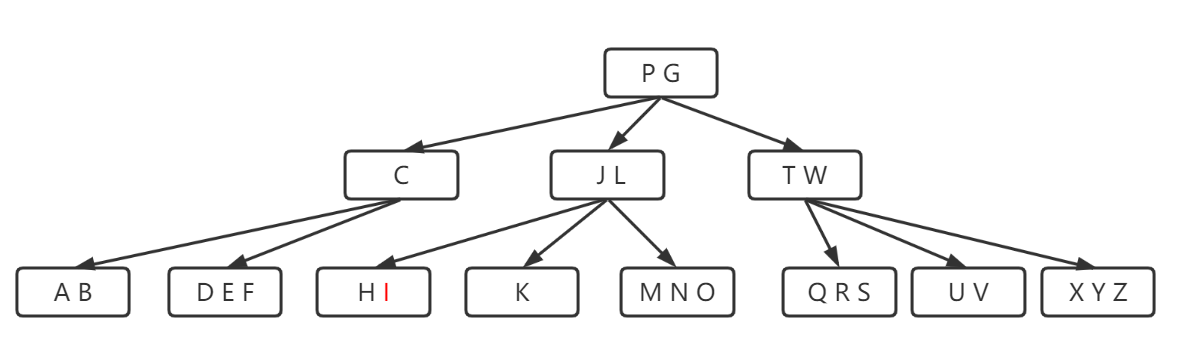 - 每一个节点的关键字按照升序排序,x和y之间孩子的范围就是(x, y)。