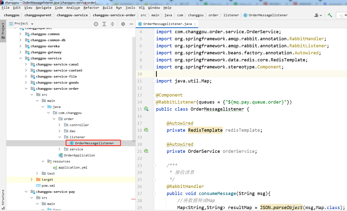 5.订单系统监听RabbitMQ中的消息获取支付状态,并根据支付状态修改订单状态