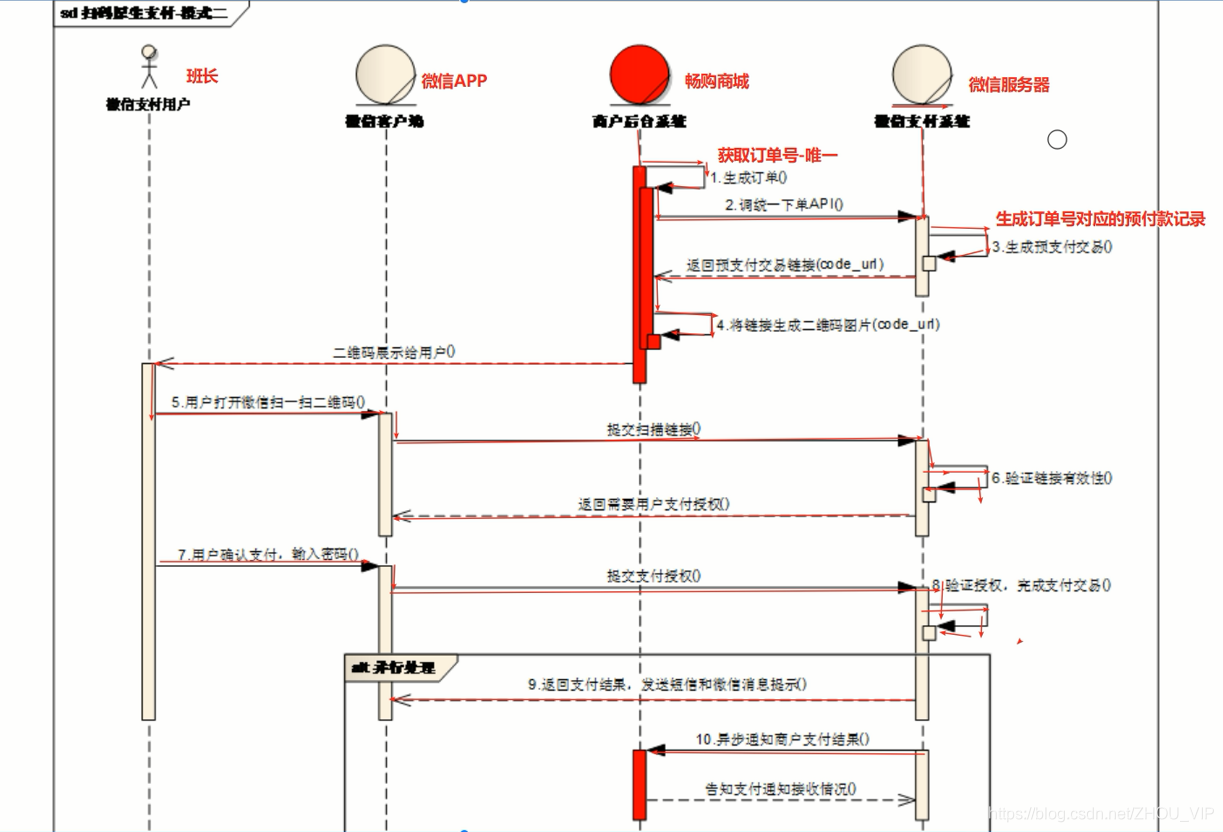 我们通过订单系统下单,然后订单系统调用支付系统去向微信支付的服务器发送请求,然后获取二