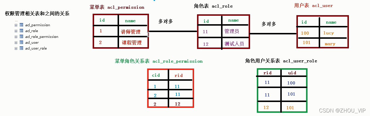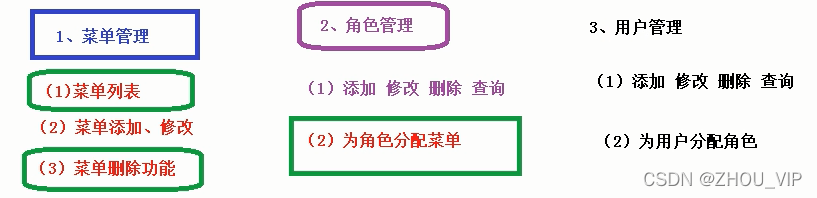 不同角色的用户登录后台管理系统拥有不同的菜单权限与功能权限,权限管理包含三个功能模块: