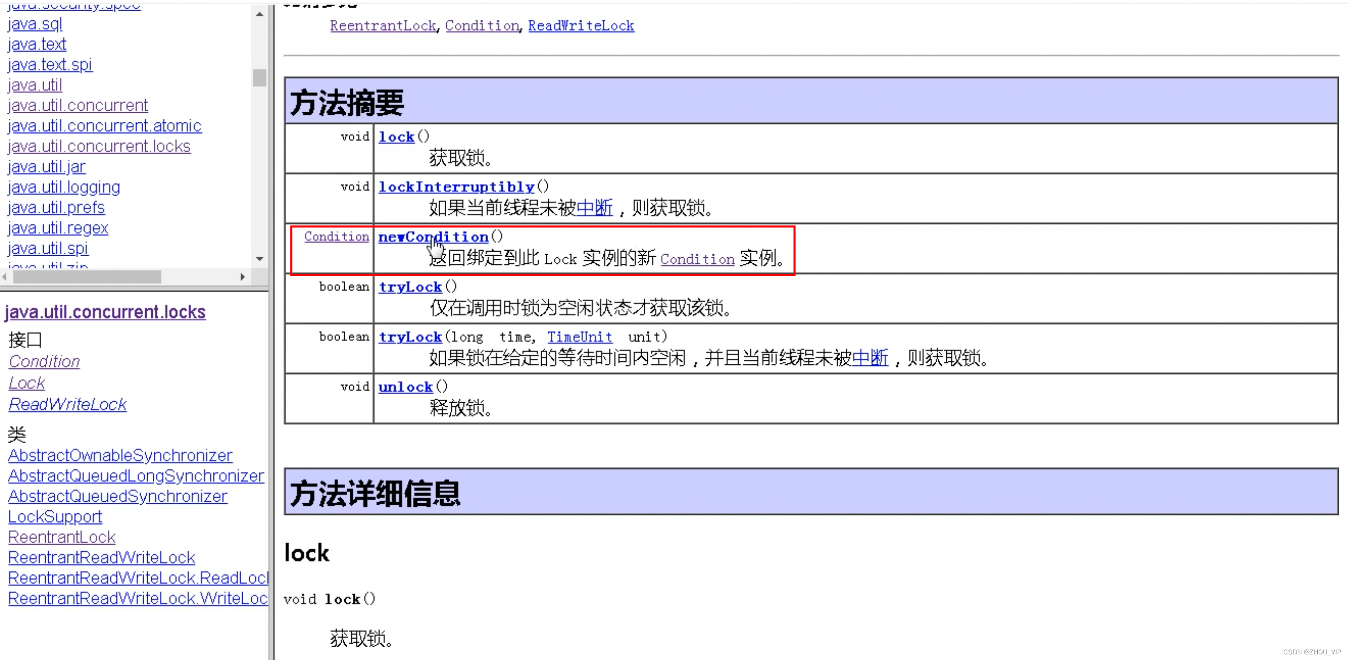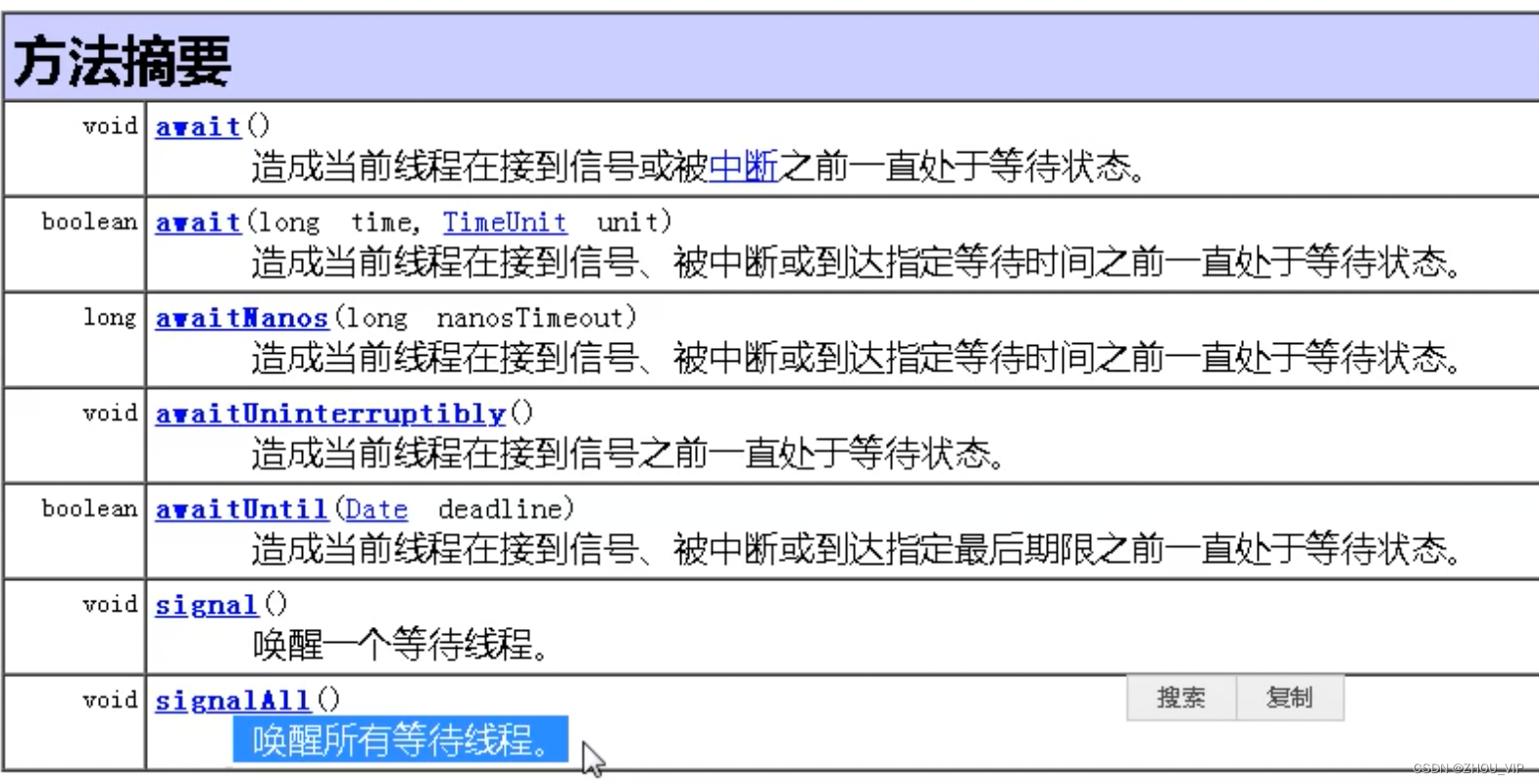 注意:在调用Condition的await()/signal()方法前,也需要线程持有相关的Lock锁,调用await()后线程会释放这个锁,在singal()调用后会从当前Condition对象的等待队列中,唤醒 一个线程,唤醒的线程尝试获得锁, 一旦获得锁成功就继续执行。