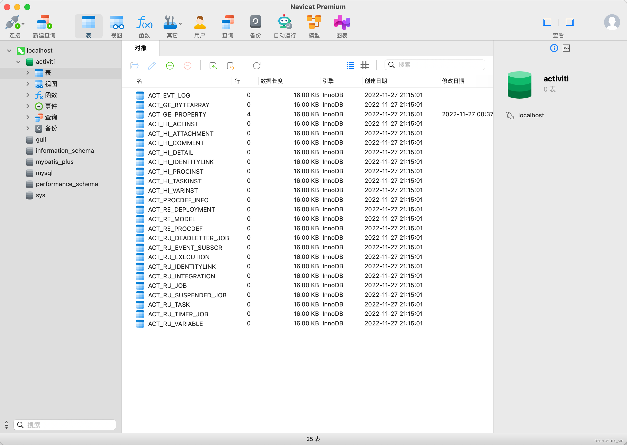 执行代码生成25张表,activiti需要依赖的业务表有25张,
