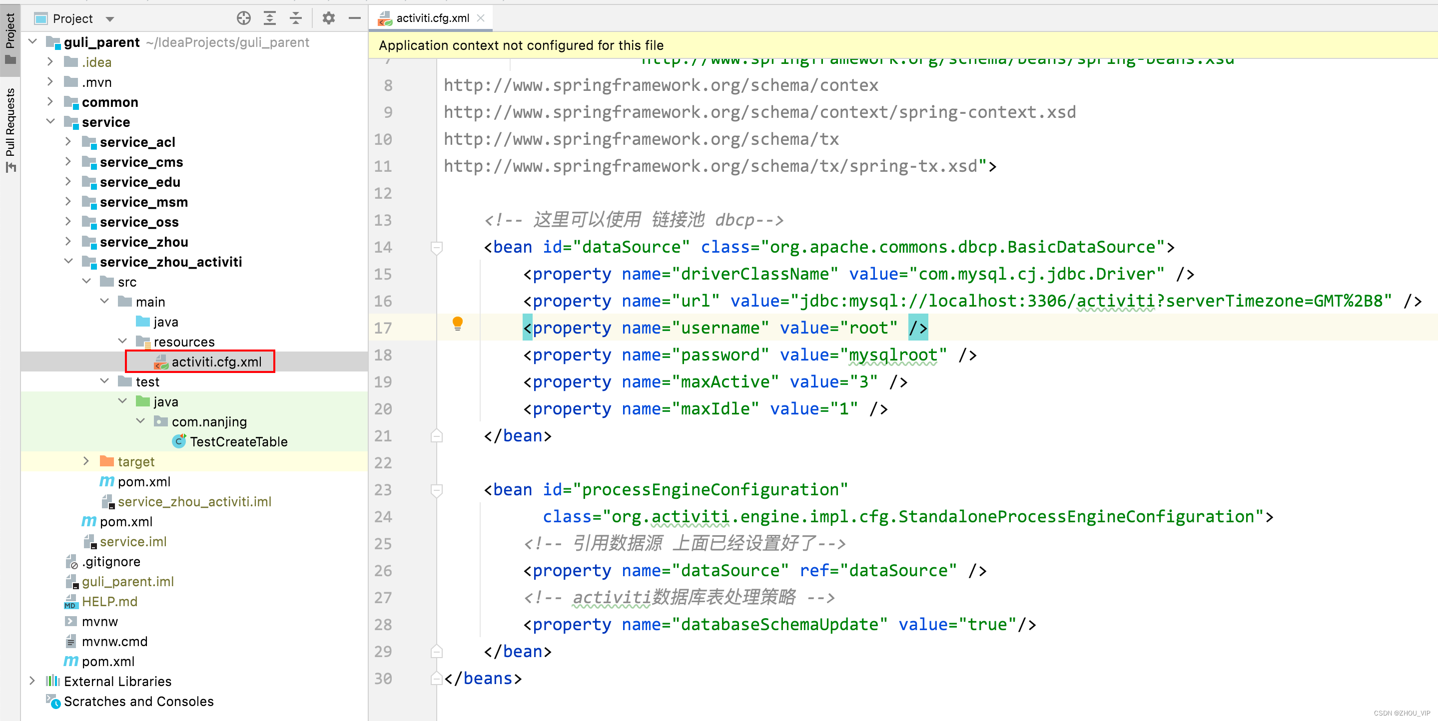 在activiti.cfg.xml中进行配置 我们可以在activiti.cfg.xml中添加关于数据库的基础配置