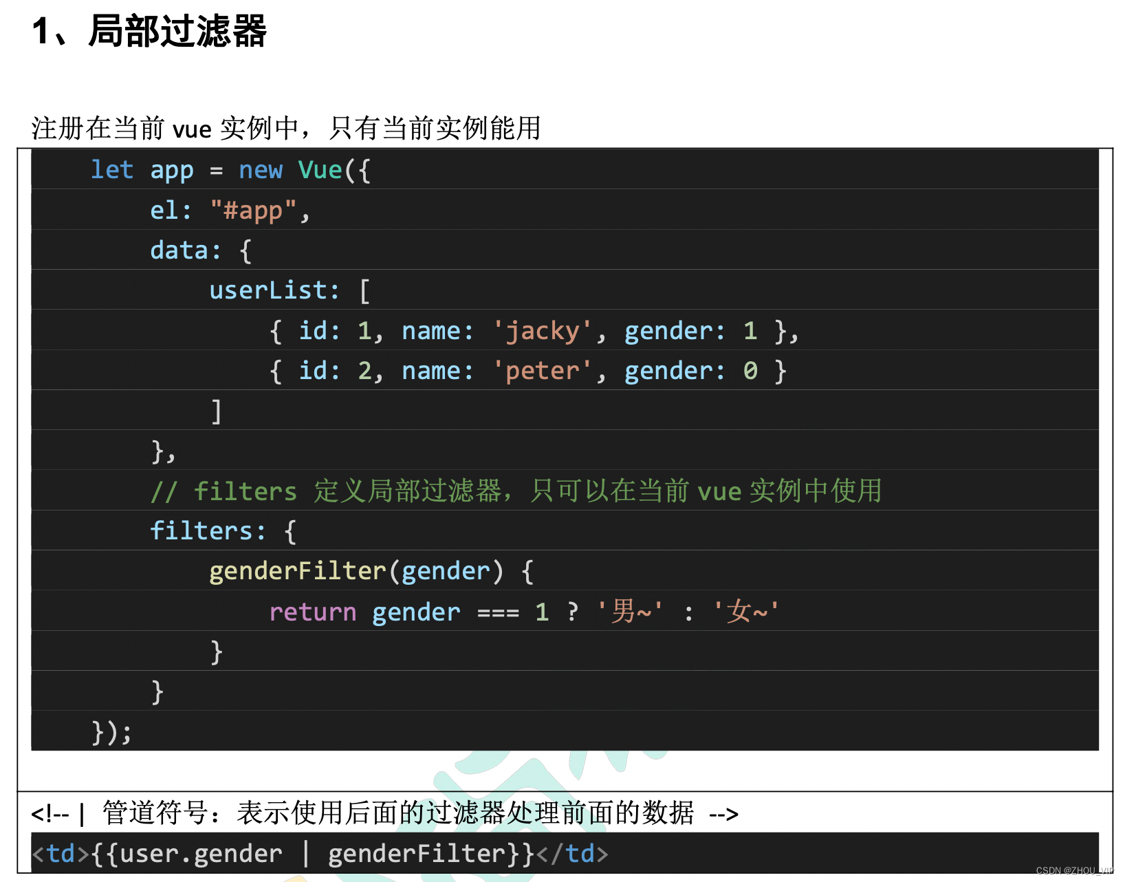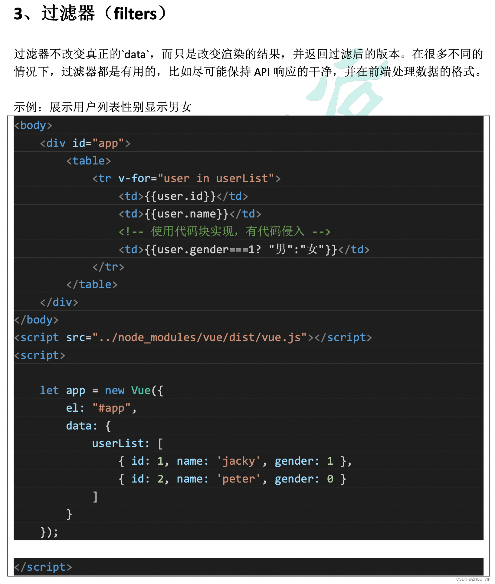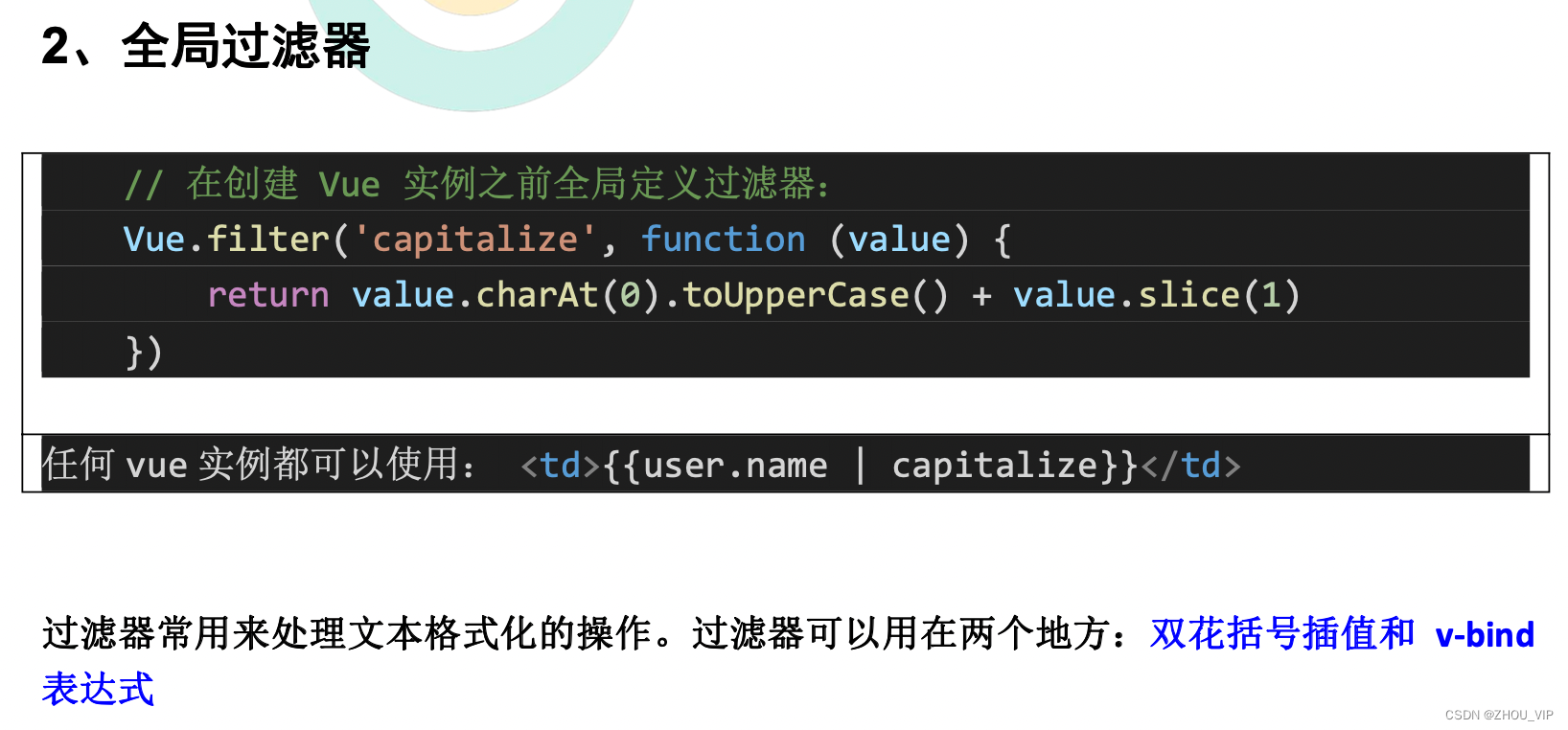 <!-- 过滤器常用来处理文本格式化的操作。过滤器可以用在两个地方:双花括号插值和 v-bind 表达式 -->