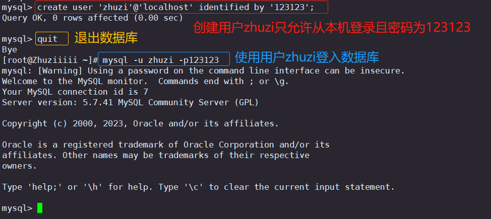 - 若省略“IDENTIFIED BY”部分,则用户的密码将为空(不建议使用)