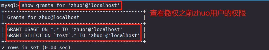 示例:允许用户zhuo在本地查询test数据库中所有表的数据记录,但禁止查询其他数据库中的表的记录