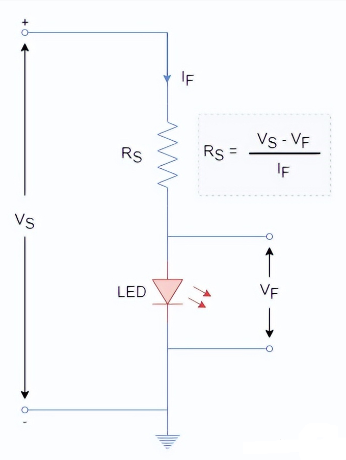 过大的电流会损坏 LED 的敏感 PN 结,因此需要在 LED 和电压源之间插入适当的串联电阻,串联电阻值不应超过 LED 额定电流的 80%,并应允许足够量的电流使 LED 显着变亮。