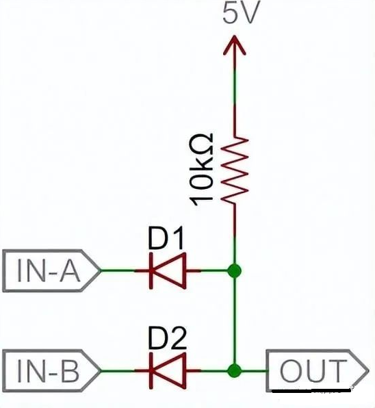 与门的构造方式类似,两个二极管的阳极连在一起,就是电路的输出所在的位置,两个输入都必须为逻辑 1,迫使电流流向输出引脚并将其拉高。如果任一输入为低电平,来自 5V 电源的电流将流过二极管。