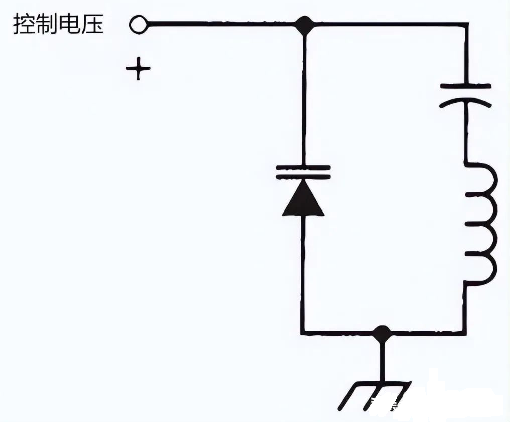 下图为一个并联调谐电路,与变容二极管相比,其值较大的固定电容器用于防止线圈使变容二极管两端的控制电压短路。